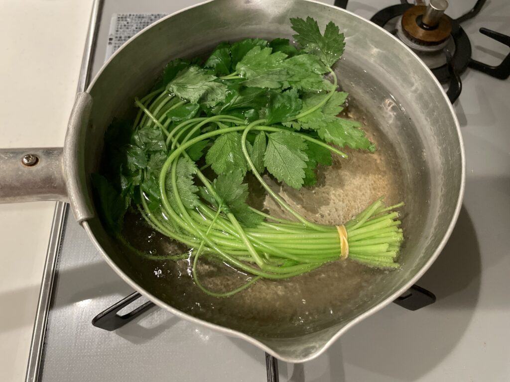 先ほどの三つ葉を茹でた湯をそのまま使って時短&節約