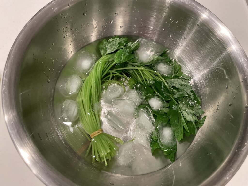 沸騰したお湯に塩(分量外)を入れて三つ葉を茹でる