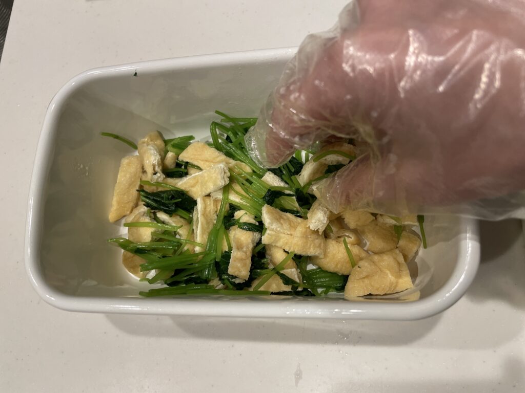 粗熱が取れたら絞って食べやすい大きさに切り、三つ葉といっしょに容器に入れておく