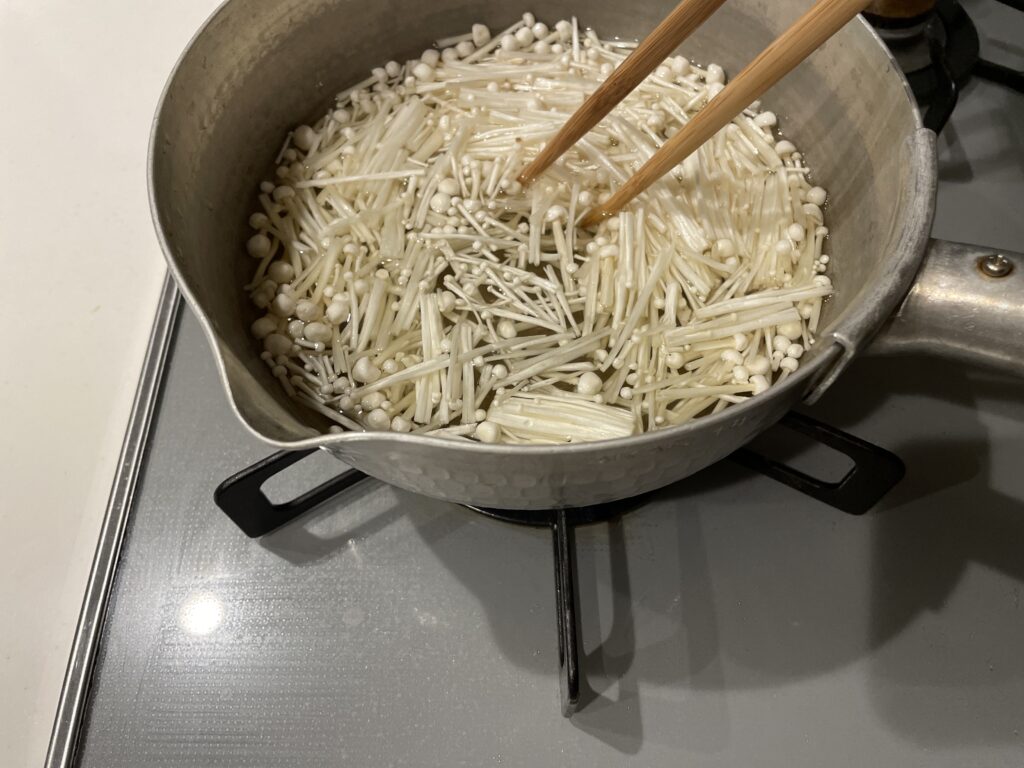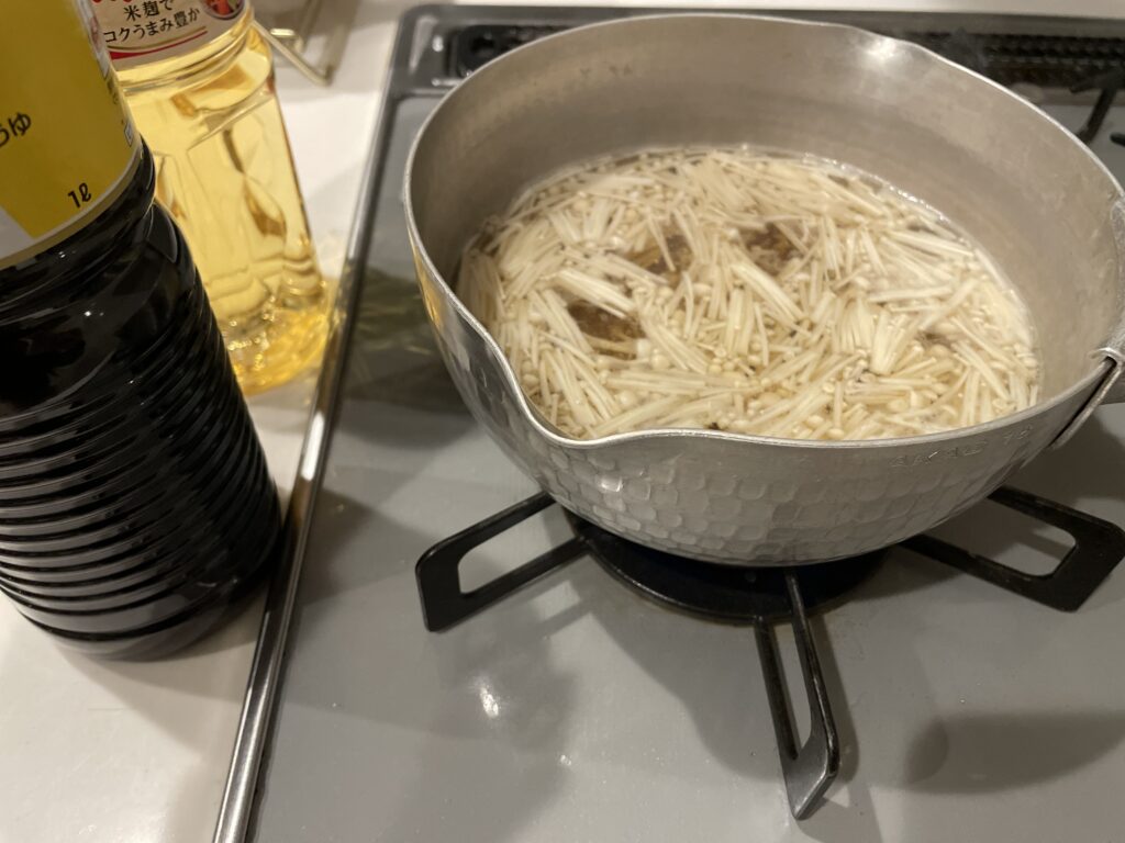 鍋に出汁330mlとえのきを(3等分の長さに切る)入れてから火にかける
